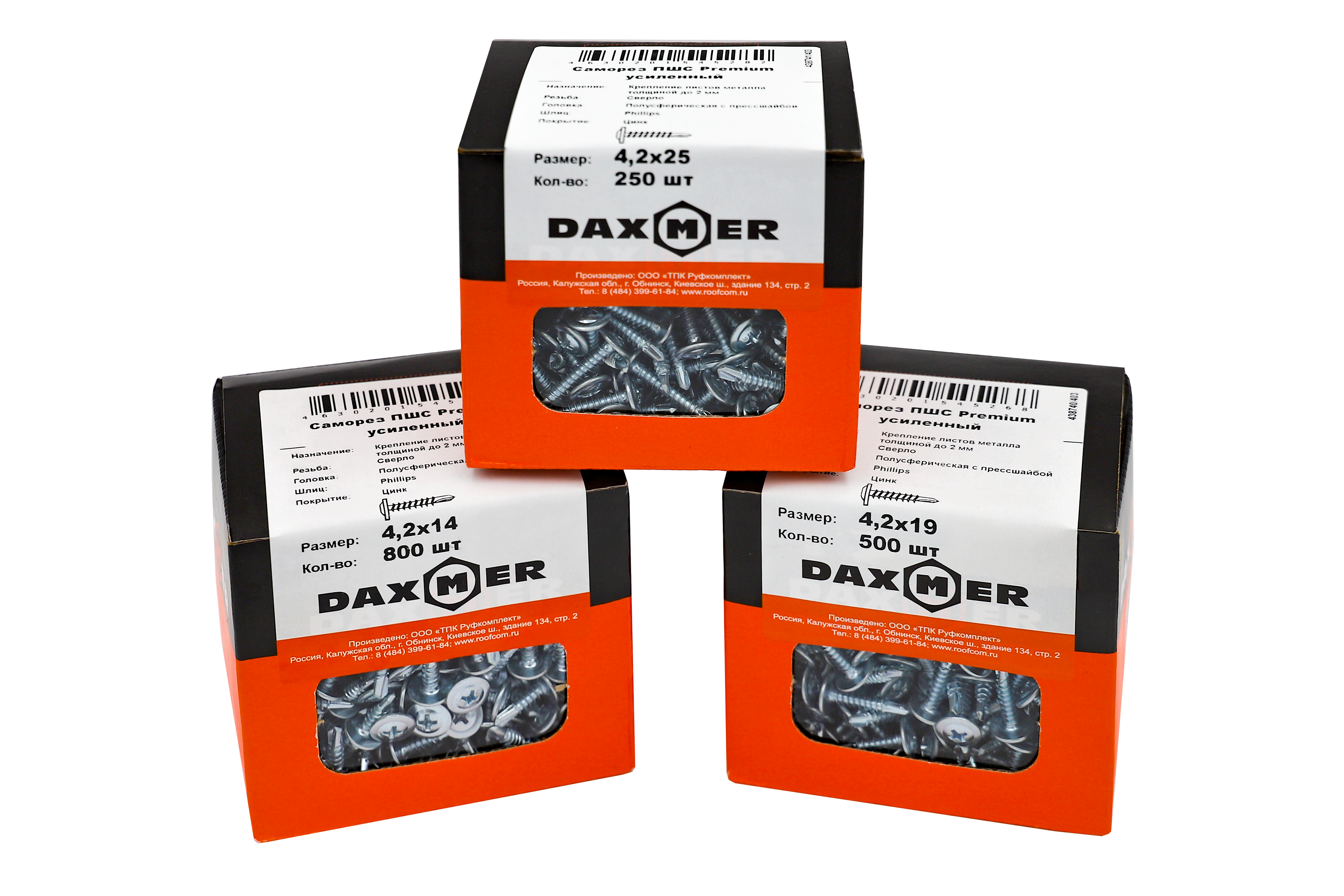 Саморез Daxmer Premium - с полусферической головкой и прессшайбой (ПШС) имеют широкую плоскую головку под крестовидную биту (PH2). Наконечник оцинкованный - сверло.